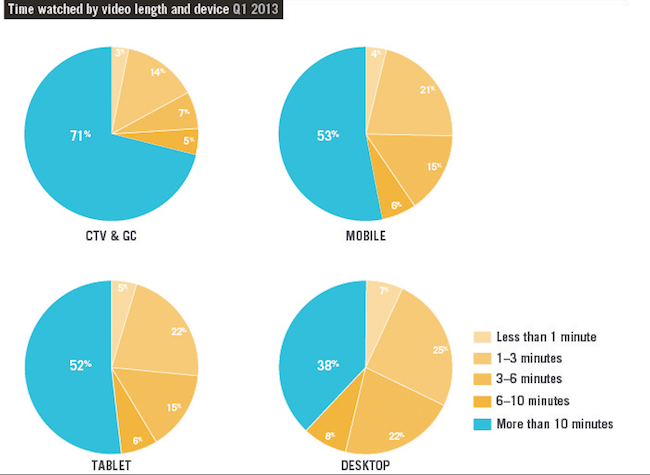 Ooyala constate, par ailleurs, que la durée des vidéos visionnées est aussi plus importante sur les supports mobiles, la moitié d’entre elles excédant 10 minutes. Un quart du temps de visionnage sur les tablettes concerne des vidéos d’une durée supérieure à une heure.