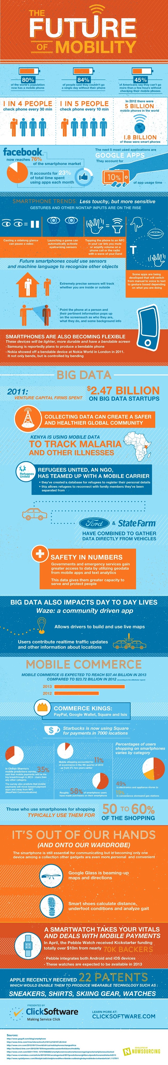 L’infographie met enfin en avant l’explosion de la collecte et l’utilisation des données, avec l’exemple de Waze, application de navigation par satellite israélienne qui vient d’être rachetée par Google pour près d’1 milliard d’euros, ou encore du m-commerce. Ce secteur devrait ainsi représenter 28 milliards d’euros cette année contre 17,77 milliards en 2012.