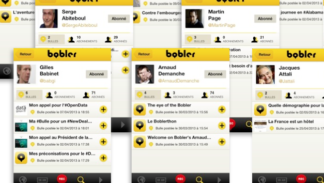 Lancé le 21 mai, Bobler est un réseau social vocal qui permet à ses utilisateurs d’enregistrer un message d’une durée de deux minutes appelé « bulle ». L’utilisateur peut ensuite, via Google Maps, géolocaliser ses bulles selon le sujet, et cela indépendamment du lieu où est enregistré le message.