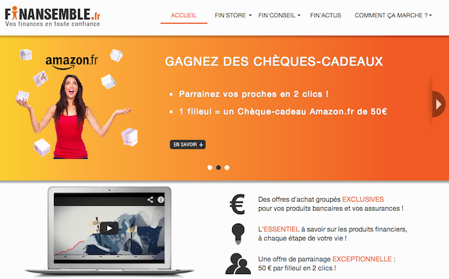 Finansemble est un site d’achats groupés de produits financiers à destination des particuliers. Le site négocie avec les banques des avantages tarifaires pour ses utilisateurs et sélectionne les offres les plus intéressantes. Il propose aussi des investissements dans le vin via Patriwine ou de prêter à d’autres particuliers avec Prêt d’Union.