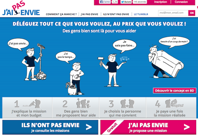 Lancé le 13 mai, J’aiPasEnvie.com est un site d’annonces sur lequel vous pouvez déléguer les tâches du quotidien à d’autres particuliers et professionnels tout en définissant vous-même le prix de la transaction. Promener le chien, faire les courses, donner des cours de peinture ou directement repeindre le plafond…