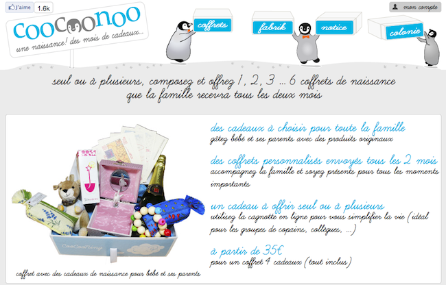 CooCooNoo permet de composer et d’offrir des coffrets thématiques comprenant des cadeaux pour les enfants et les parents. Les coffrets sont différenciés en fonction de la croissance du bébé au cours de sa première année : CooCooNing (0 à 3 mois), Eveil (3 à 4 mois), A table (5 à 6 mois)… Différentes offres existent, de 35 euros pour un coffret unique de quatre cadeaux à 300 euros pour un abonnement sur un an.