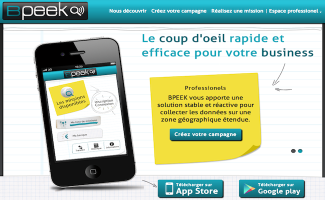 Alors que le marché des données attise les convoitises des plus grands du Web, BPeek fait le pari d’utiliser les mobinautes pour réaliser cette collecte. Chaque jour, les utilisateurs de l’application BPeek ont accès à des missions (photographier une vitrine, un produit, tester un service…) de proximité et d’être rémunérés si le résultat est jugé satisfaisant par l’employeur temporaire.