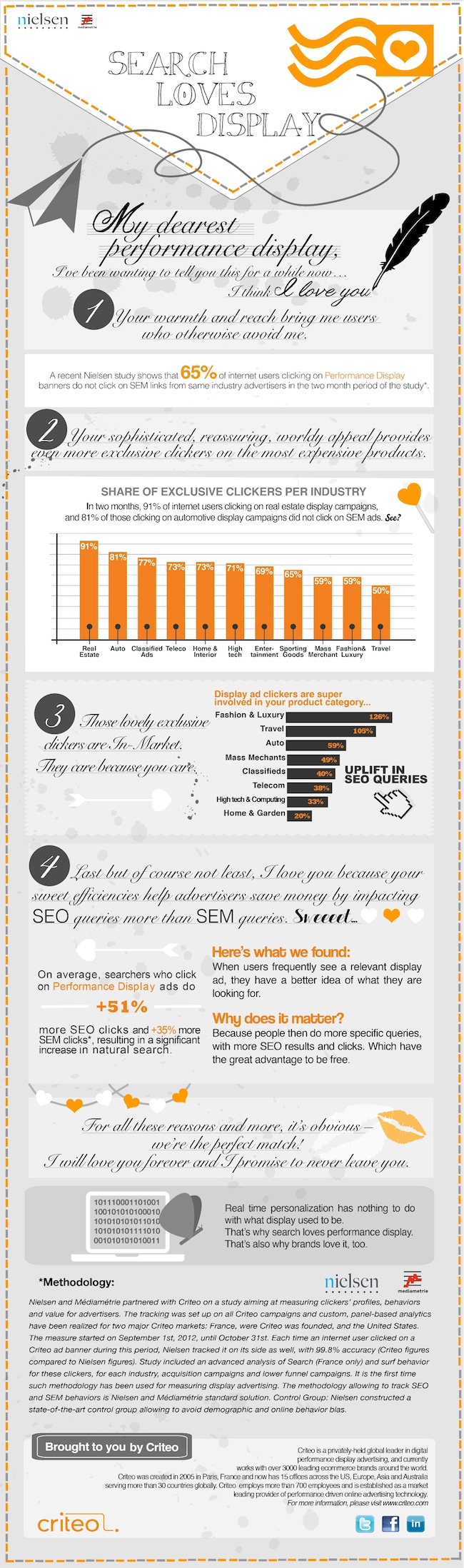 Criteo, en association avec Nielsen et Médiamétrie, nous indique – avec passion – dans l’infographie ci-dessous que les secteurs les moins concernés sont la mode et les voyages, où la part d’internautes cliquant exclusivement sur le display n’est que de 59 et 50%. À l’inverse, on constate chez ces personnes une hausse des requêtes SEO pour ces types de produits supérieure à 100%.
