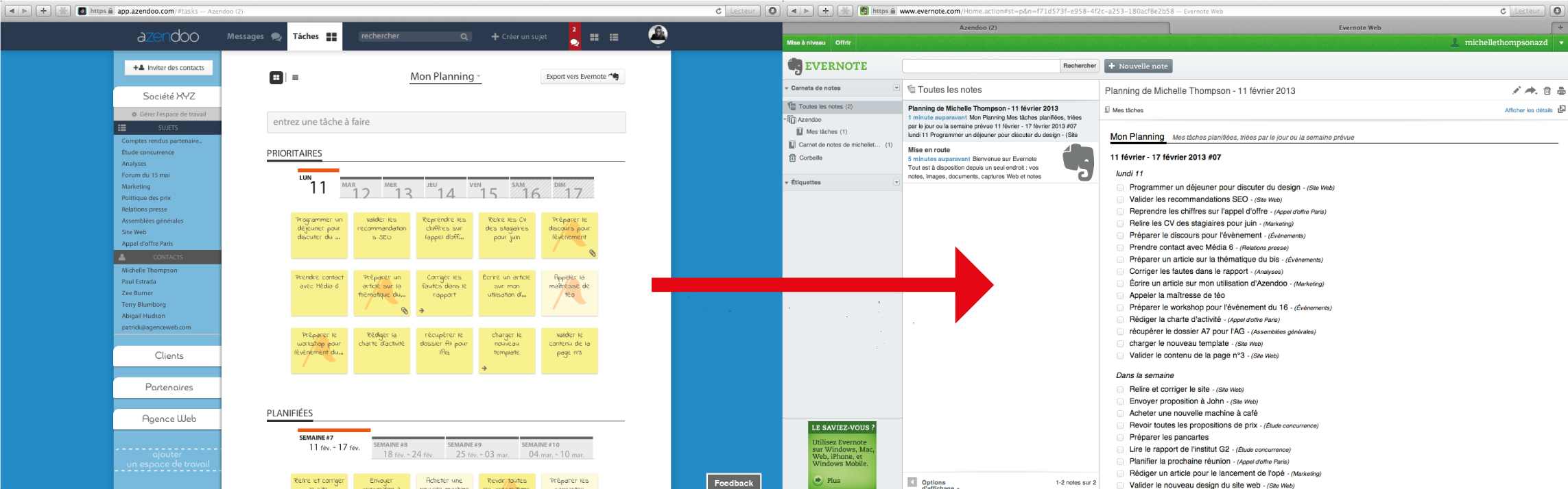 Azendoo intégre donc dès aujourd’hui les notes Evernote dans son interface afin d’offrir la possibilité à ses utilisateurs de partager facilement du contenu à plusieurs et de l’organiser dans des espaces de collaboration dédiés. Les internautes peuvent désormais partager leurs notes Evernote personnelles et Evernote Business directement depuis un message ou une tâche Azendoo, et sauvegarder leurs listes de tâches personnelles ou de projets vers leur carnet de note Evernote en un clic.