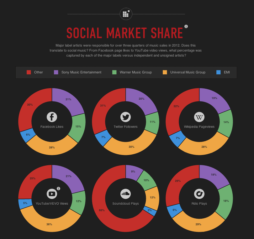 La start-up américaine Next Big Sound, qui fournit depuis 2009 des datas et analytics aux professionnels de l’industrie musicale (indices de popularité des artistes sur les réseaux sociaux, les services de streaming ou encore les radios, statistiques d’écoutes…), a récemment diffusé un « état des lieux » de la musique digitale en se basant sur des informations trackées via sa plateforme en 2012.