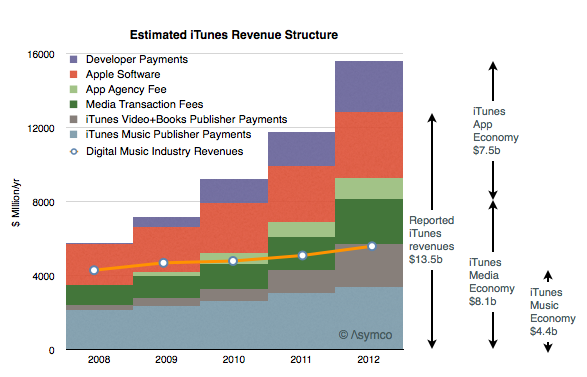 Ce chiffre sera le résultat de données divulguées par Apple (4,3 milliards de dollars générés par la vente de musique sur iTunes dont 3,4 milliards reversés aux ayants droit), couplées aux données de l’IFPI (la Fédération Internationale de l’Industrie Phonographique) qui rapporte que la musique digitale aurait généré 5,6 milliards de dollars soit 34% du chiffres d’affaires total de l’industrie de la musique enregistrée.