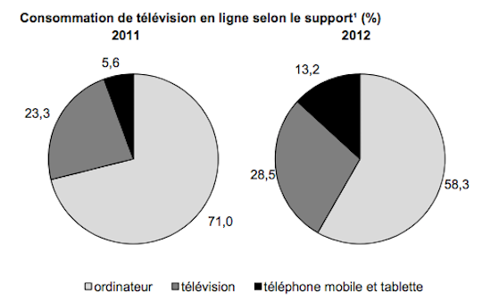 La consommation de ces contenus a aussi évolué: si le PC reste le support privilégié (58,3% des contenus consultés en 2012 contre 71% un an auparavant), les TV connectées et les devices mobiles percent avec respectivement 28,5% et 13,2% en 2012 contre 23,3% et 5,6% en 2011.