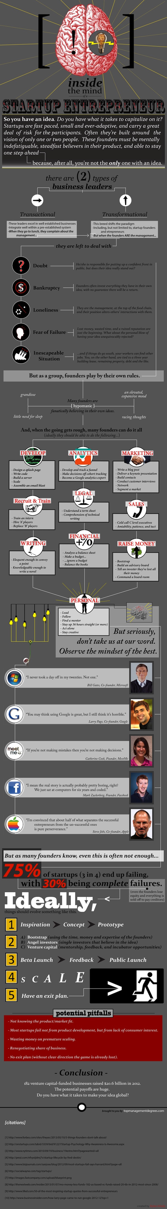Dans ces conditions, entreprendre demande souvent un grain de folie note le site topmanagementdegrees.com, à l’origine de l’infographie ci-dessous. Si on y apprend qu’un grand nombre d’entrepreneurs sont hypomaniaques, un état psychologique marqué par un besoin moindre de dormir et se reposer, une hyper-compétitivité et une hyper-productivité, cette dernière nous détaille aussi quelques étapes de l’aventure start-up: