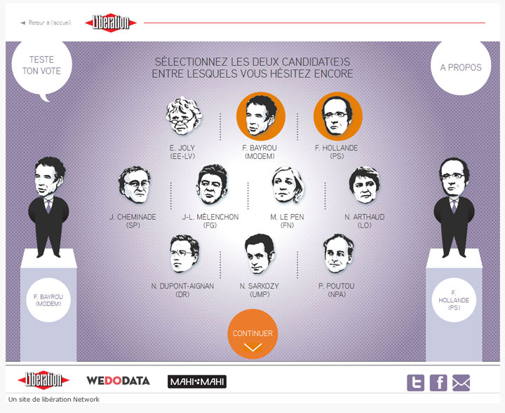 Fondée en 2011 par Karen Bastien (CFJ, ancienne rédactrice en chef de Terra Eco) et François Prosper (graphiste d’informations) WeDoData est une agence spécialisée dans le journalisme de données. L’idée: mettre en forme l’actualité en se servant des données. Le journaliste analyse les informations chiffrées et le graphiste les met en scène. WeDoData a plusieurs fois travaillé avec le quotidien Libération, qui a eu recours à la data visualisation lors de la campagne présidentielle de 2012.