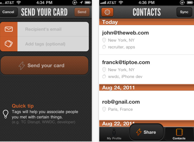 Une fois votre profil rempli, vous n’avez plus qu’a remplir l’adresse email de votre correspondant. Vos informations sont transmises au format universel .vcf,et peuvent être associés via des tags au lieu où vous avez rencontré une personne (RV professionnel, conférence…). Elle peuvent également être synchronisées avec synchroniser vos contacts avec votre carnet d’adresses iOS et Google Contacts. L’application est disponible en français et anglais.