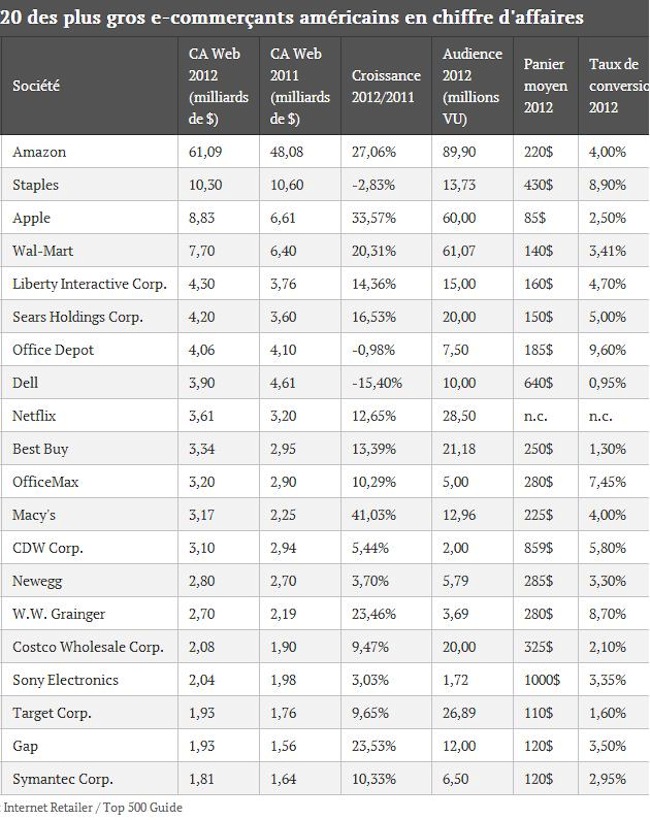 Avec un CA de 62 milliards de dollars, supérieur à ceux de ses 12 principaux concurrents réunis, Amazon écrase littéralement le marché selon une étude d’Internet Retailer publiée en début de mois.
