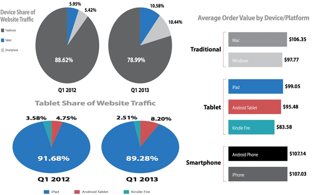 Si la tablette est privilégiée par rapport au téléphone portable, l’étude rapporte que les possesseurs d’iPad sont particulièrement actifs sur les sites de e-commerce puisqu’ils représentent plus de 89% du trafic de ces derniers sur le support.