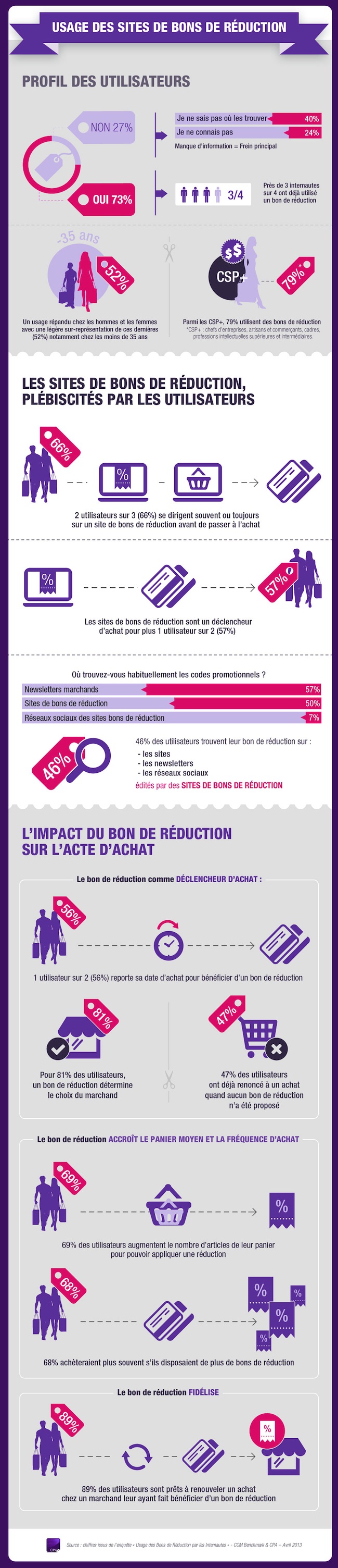 C’est ce que nous apprend cette infographie issue d’une étude réalisée par CCM Benchmark publiée aujourd’hui. 73% des Français auraient ainsi déjà utilisé un coupon de réduction avant d’acheter en ligne et 66% d’entre eux ont maintenant le réflexe de consulter un site de couponing avant une séance de shopping virtuelle. 81% des internautes choisissent leur marchand en fonction des bons de réduction disponibles.