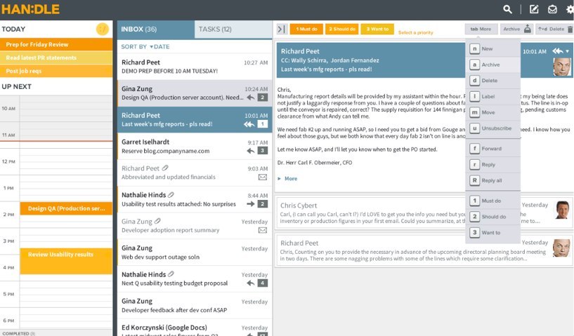 Comme l’explique TechCrunch, Handle permet de trier efficacement les e-mails, mais surtout de créer et d’organiser des tâches à partir de votre boîte de réception. Ainsi, cet outil permet d’obtenir un véritable agenda, à partir du tri intelligent des e-mails. Il rappelle d’ailleurs certaines fonctionnalités de Mailbox, une application qui organise en tâches précises la gestion des e-mails. Handle promet de faciliter l’organisation des travailleurs du tertiaire, qui passent en moyenne 20 heures par semaine à traiter leurs e-mails.  Rapide et ergonomique, l’application permet de grouper, repousser et hiérarchiser les e-mails en appuyant sur une touche seulement. Toutefois, Handle ne possède pas encore de barre de recherche, ce qui limite son efficacité. En outre, dans un premier temps, l’application ne fonctionnera que sur Gmail.