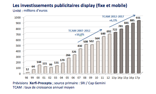 En 2017, le total des investissements dans la publicité display devrait ainsi représenter 931 millions d’euros en 2017 contre les 722 millions prévus cette année et les 692 millions de 2012. Malgré un ralentissement de la croissance totale des investissements publicitaires, la part du digital dans les budgets devrait passer de 11,3% en 2012 à 13,2% en 2017.
