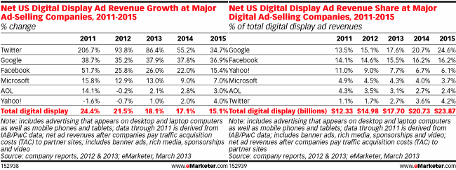 Les grands groupes américains devraient eux connaitre une croissance de plus en plus forte: Google, qui a pris la place de leader à Facebook l’année passée, conserve cette position en 2012 avec 2,26 milliards $ de revenus nets contre 2,18 pour Facebook. L’étude table aussi sur une croissance annuelle moyenne de 37,5% pendant 3 ans pour la firme de Mountain View qui atteindra 5,87 milliards de revenus nets et près de 25% de PdM en 2015.