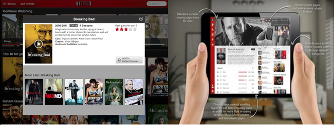 Nouvelles animations, plus de fonctionnalités et meilleure intégration avec les réseaux sociaux… L’agence média canadienne YOU iLabs revisite l’application iPad de Netflix, le service américain de streaming vidéo à la demande aux 30 millions d’abonnés.