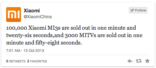 Le fabricant chinois Xiaomi, qui s’est lancé à l’assaut du marché de la vente de smartphones à bas prix, déclare sur Twitter avoir déjà vendu 100 000 modèles « Xiaomi Mi3 » en seulement 86 secondes, et 3000 modèles de smart TV en deux minutes. La firme chinoise qui vient d’embaucher l’ex-Google Hugo Barra a vendu 7 millions d’appareils commercialisés, et a engrangé 2,5 milliards de dollars de recettes au cours de la première moitié de 2013.
