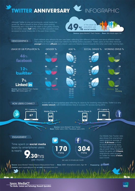 Alors que Twitter vient de souffler sa septième bougie jeudi 21 mars dernier, Ipsos nous offre dans une infographie un panorama de l’usage des réseaux sociaux en Grande-Bretagne.