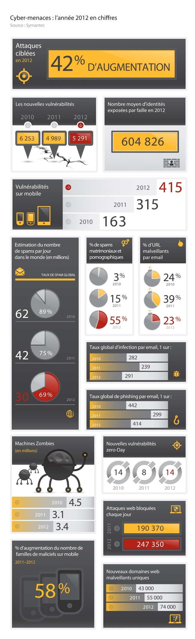 Le spécialiste de la sécurité informatique Symantec revient dans cette infographie sur les chiffres-clefs de l’année 2012 en matière de cyber-menace. On apprend ainsi que le nombre d’attaques ciblées a augmenté de 42% entre 2011 et 2012, tandis que le nombre de vulnérabilités détectées est passé de 4989 à 5291, en hausse de 6%. Avec 247 000 contre 190 000 en 2011, le nombre d’attaques web bloquées chaque jour a augmenté de 30% en un an.
