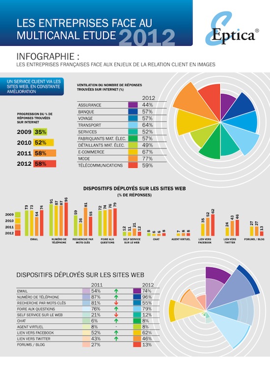 Eptica, spécialiste de solution multicanal de gestion des interactions clients, a publié une infographie reprenant les principaux chiffres de sa dernière étude intitulée « les entreprises face au multicanal 2012 ». Cette dernière a analysé la qualité du service client web de 100 entreprises françaises BtoC dans 10 secteurs différents: assurance, banque, tours opérateurs, opérateurs de transport, fournisseurs d’énergie, fabricants de produits électroniques, etc.