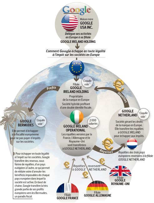 Pour appuyer ses dires, l’OCDE donne l’exemple « grotesque » de Google : une maison mère aux États-Unis, qui délègue ses activités en Europe à sa filiale irlandaise, qui reçoit des royalties de la France, de l’Allemagne et du Royaume-Uni avant que ceux-ci atterrissent aux Bermudes. Au final, pas (ou presque) d’impôts pour le géant de l’Internet.