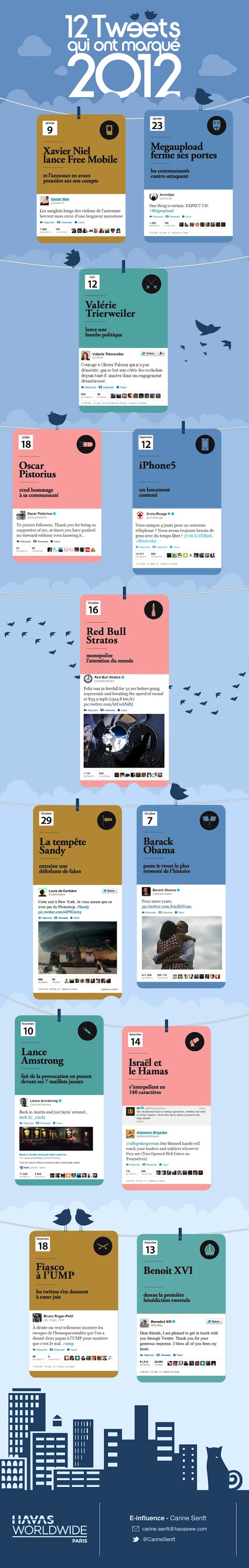 Avec une audience en progression de 150% et un volume de tweets en croissance de 350%, Twitter a connu cette année une progression fulgurante en France. Partant de ce constat, l’agence Havas Paris a publié une infographie dans laquelle elle compile les 12 tweets les plus marquants de l’année 2012.