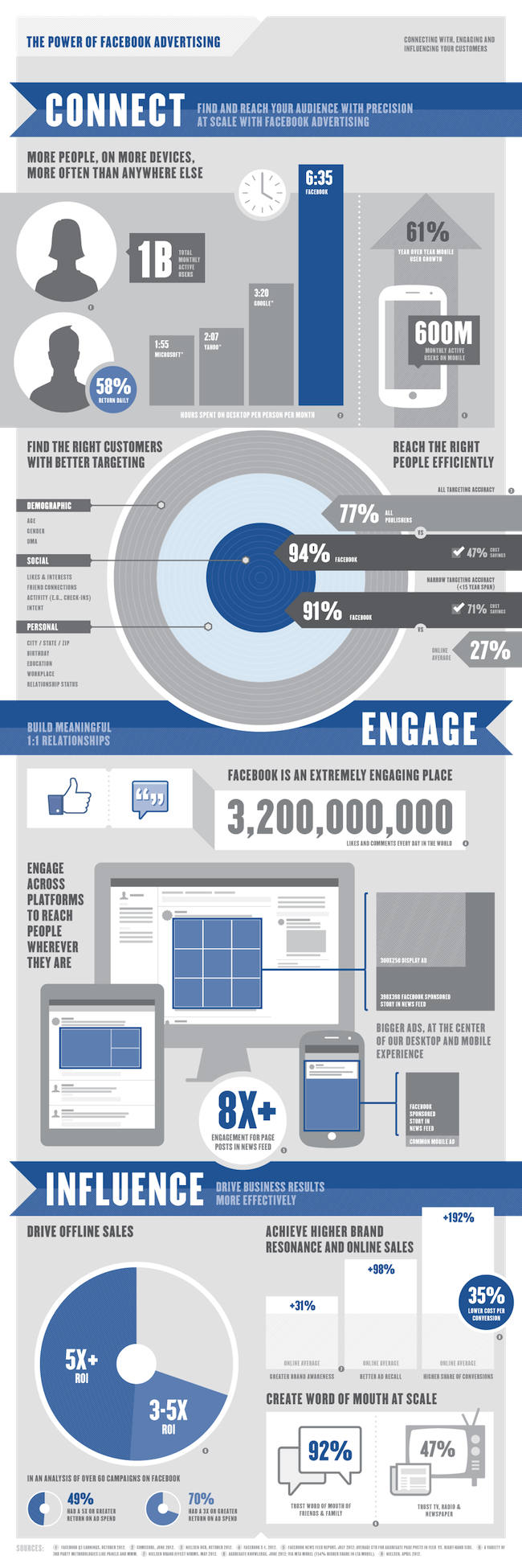 - Un taux de ciblage de 91%, contre une moyenne de 27% pour le reste de la publicité en ligne. Facebook tire avantage des données précises récoltées au travers des quelques 3,2 milliards de mentions « j’aime » et de commentaires publiés chaque jour sur la plateforme communautaire.