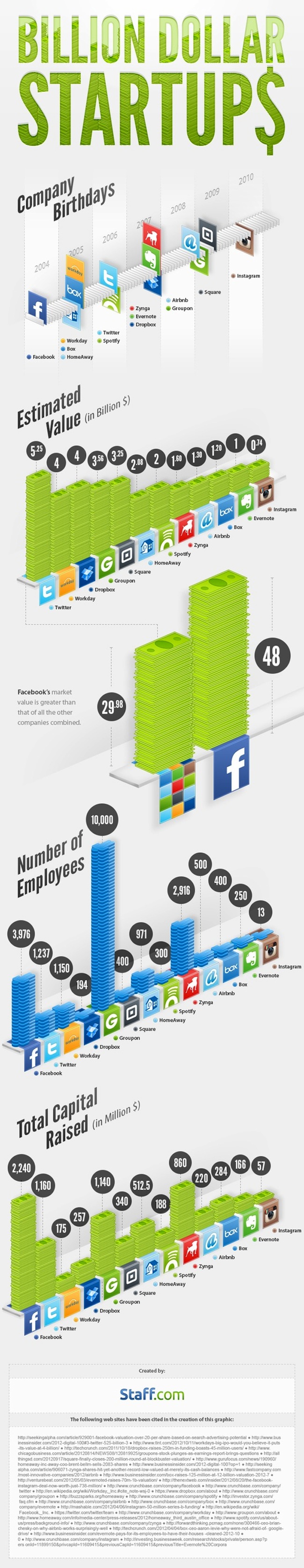 48 milliards de dollars de valorisation pour Facebook… 13 employés pour Instagram… 500 millions de dollars levés par Airbnb … Proposée par Staff.com, l’infographie ci-dessous illustre les plus grands succès des startups du Web.