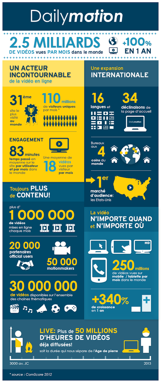 L’infographie nous apprend aussi l’importance du secteur mobile pour Dailymotion avec 250M de vues par les mobinautes en 2012, en augmentation de 340% sur l’année.