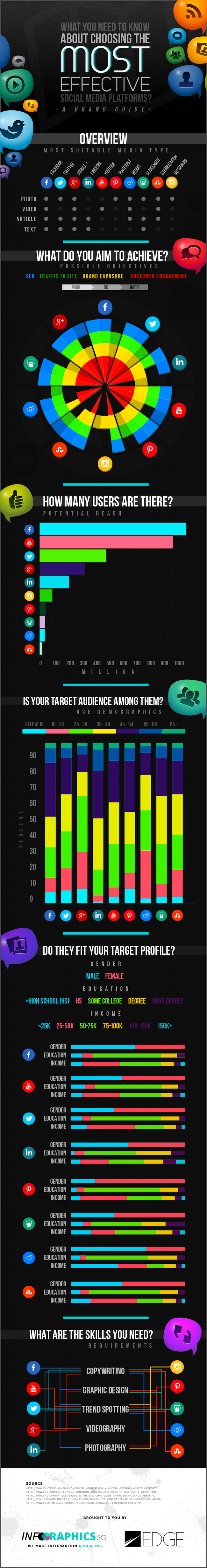 Qu’ils soient dédiés à l’image comme Pinterest ou Instagram, à la vidéo comme Youtube ou à la curation de contenu comme Reddit et Stumbleupon, les réseaux sociaux ont tous leurs propres spécificités. Proposée par Infographics.sg, l’infographie ci-dessous met en avant l’importance du choix de ces supports de diffusion pour les marques selon leurs objectifs de brand content, de génération de trafic ou encore d’acquisition client.