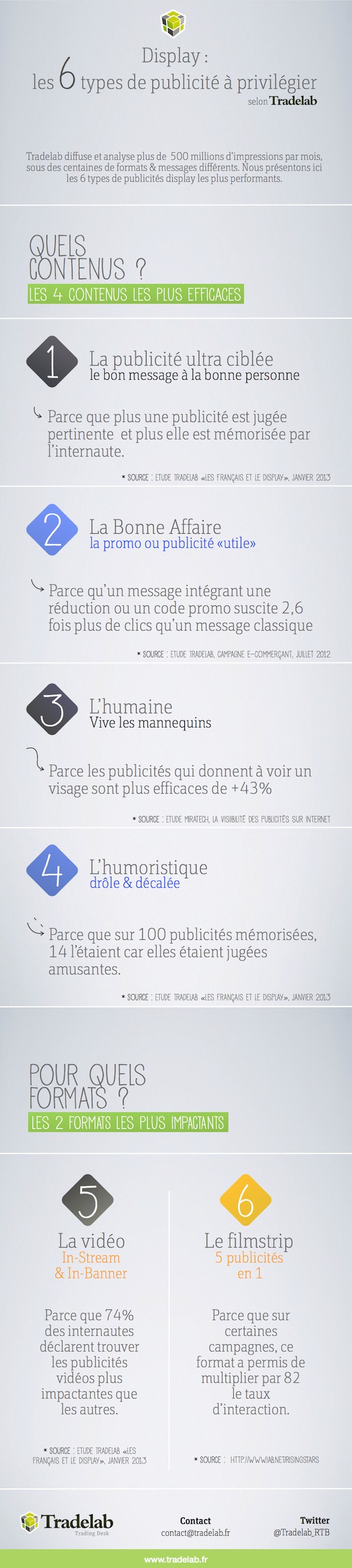 Quelles sont les publicités les plus performantes en display ? Les contenus les plus efficaces ? Les formats les plus impactants ? Réalisée par Tradelab, agence spécialisée dans les campagnes display en Real Time Bidding, l’infographie ci-dessous répond à toutes ces questions.