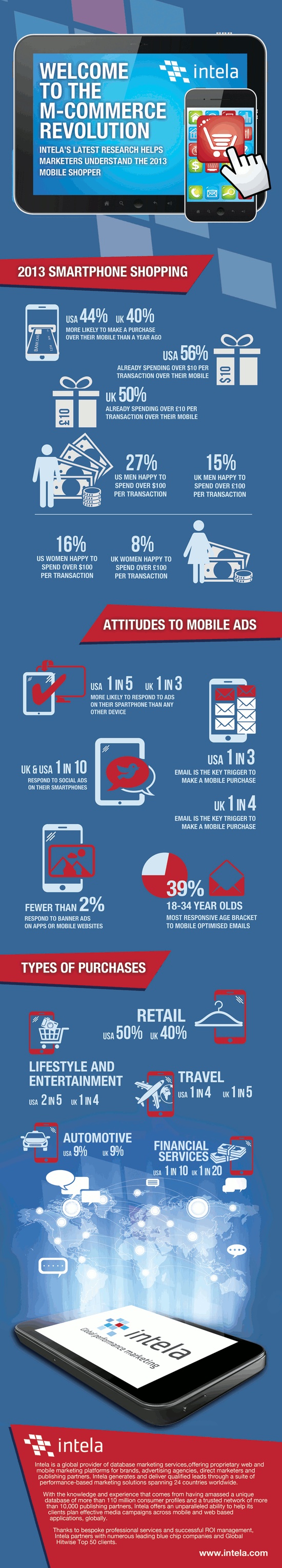 Réalisée par l’agence marketing Intela, l’infographie ci-dessous revient sur les pratiques liées au m-commerce aux Etats-Unis et au Royaume-Uni.