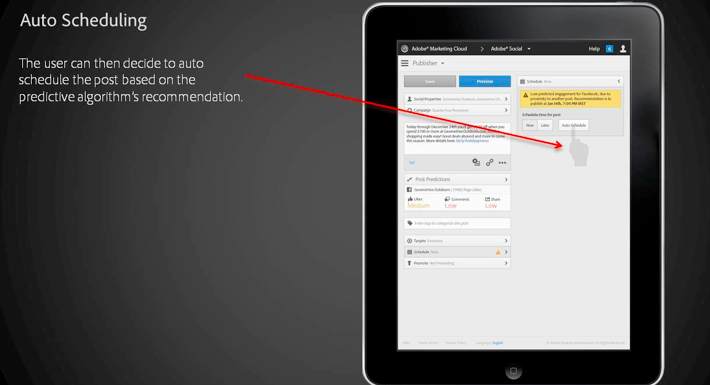 Cette nouvelle fonctionnalité anticipe le potentiel d’engagement social d’un contenu et propose une suggestion de contenu, une date de publication, mais aussi l’utilisation de mots-clefs maximisant les retours obtenus. Adobe indique faire appel au text mining, procédé qui se base sur des données historiques, dates de publication et commentaires. Au fur et à mesure, la solution affine les recommandations et cible plus efficacement chaque action.