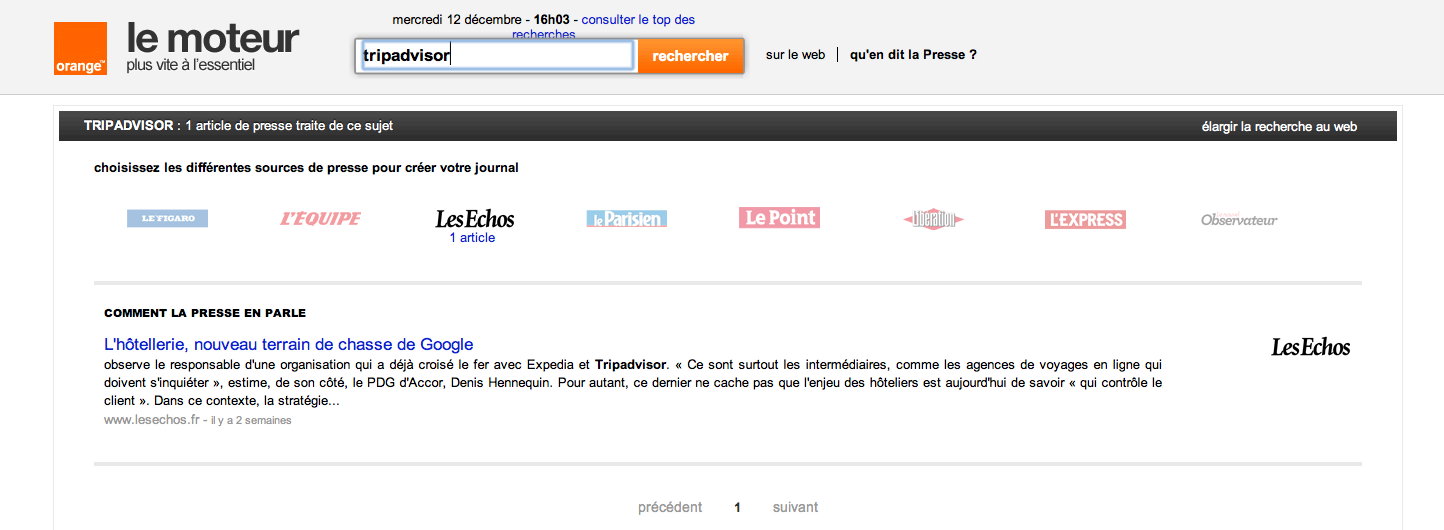 Cependant, nous avons fait le test, et le résultat n’était pas vraiment à la hauteur de nos espérances. Après avoir entré « Tripadvisor » dans la barre de recherche, « Le Moteur » nous propose un seul article, provenant des Echos et publié 2 semaines auparavant. Pourtant, Le Figaro a publié ce midi un article sur la prise de contrôle du premier site de voyage au monde par Liberty Interactive, tout comme Les Echos.