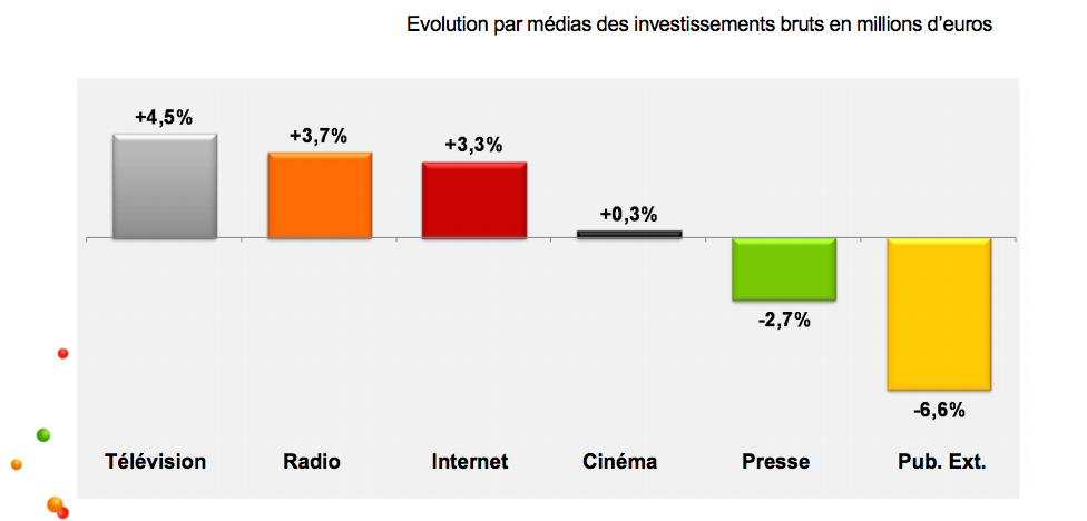 Cette faible augmentation s’explique notamment par une chute des investissements dans les secteurs de la publicité extérieure (-6,6%) et de la presse (-2,7%). Le web, habituellement moteur de croissance du marché, affiche, pour sa part, une petite hausse de 3,3% des investissements sur l’année.