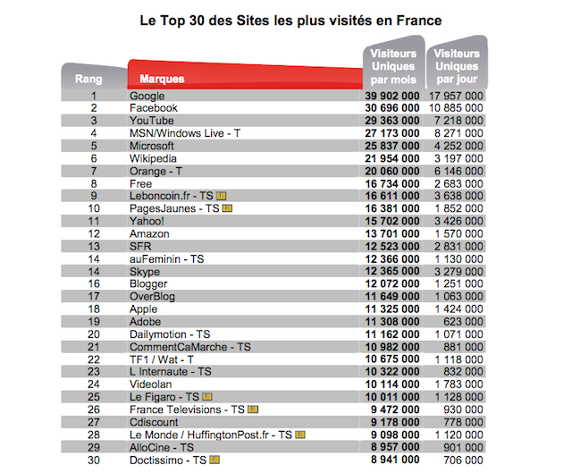 C’est ce que révèle une récente étude Médiamétrie sur l’audience de l’Internet en France: plus de 6,6M d’internautes français ont représenté 55,2% de l’engagement sur Internet en France en février. L’étude nous livre aussi le Top30 des sites les plus visités durant la période.