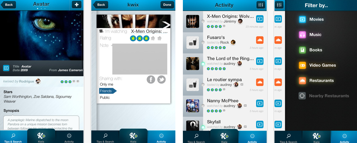 Elle permet à ses utilisateurs d’émettre des commentaires sur leurs activités culturelles : musées, cinéma, littérature, etc. Et ainsi de recommander ou non un produit ou une activité. Plus le mobinaute émet de recommandations, plus ces dernières deviennent pertinentes. En échange, ceux-ci profitent de recommandations de la part de Kwixer sur des produits similaires à leurs goûts.