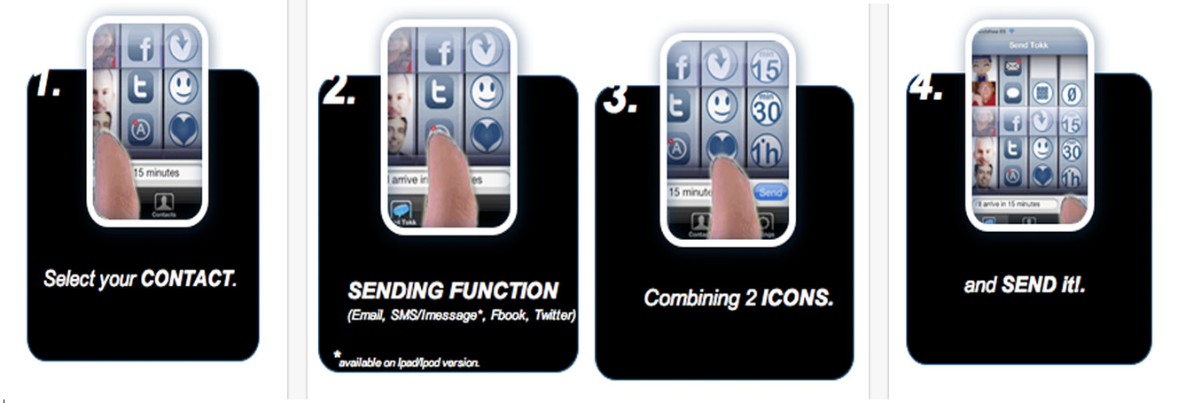 Tokks est une application qui permet d’accélérer et de faciliter le processus d’envoi de messages (SMS, Email, Facebook, Twitter) grâce à des textes pré-rédigés.