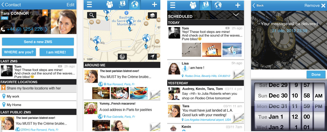 ZMS propose également de nombreuses autres fonctionnalités : messagerie instantanée, synchronisation des contacts via le carnet d’adresses, et l’accès à une communauté ZMS ou les utilisateurs partagent des informations et des bons plans sur un lieu, un établissement, une boutique…