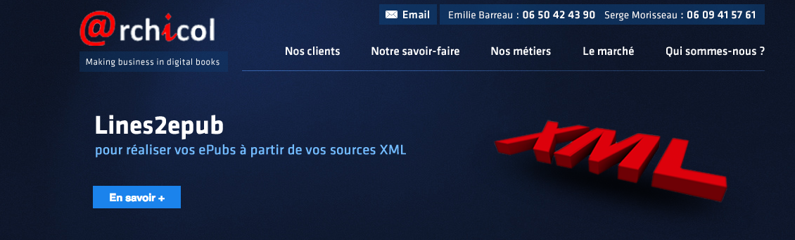 Fondé en 2012 par Serge Morisseau, Emilie Barreau et David Dauvergne, Archicol propose aux professionnels des solutions logicielles simples et automatisées pour la production et l’édition de leurs contenus numériques, dans le respect des normes de l’ePub et en intégrant un retour à la sortie papier (print on demand).