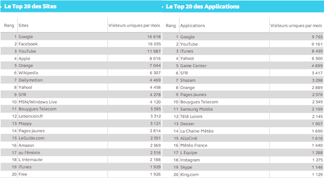 Le Top20 des sites de l’Internet mobile est toujours dominé en mars par le traditionnel triptyque Google, Facebook, Youtube, avec respectivement 16,6 millions, 16,05 millions et 12 millions de VU, en augmentation par rapport à janvier (16,3M, 15,7M et 11,4M de VU). Google est aussi en tête du classement des applications les plus consultées avec 9,7 millions de VU, de peu devant Youtube et ses 9,1 millions de VU.
