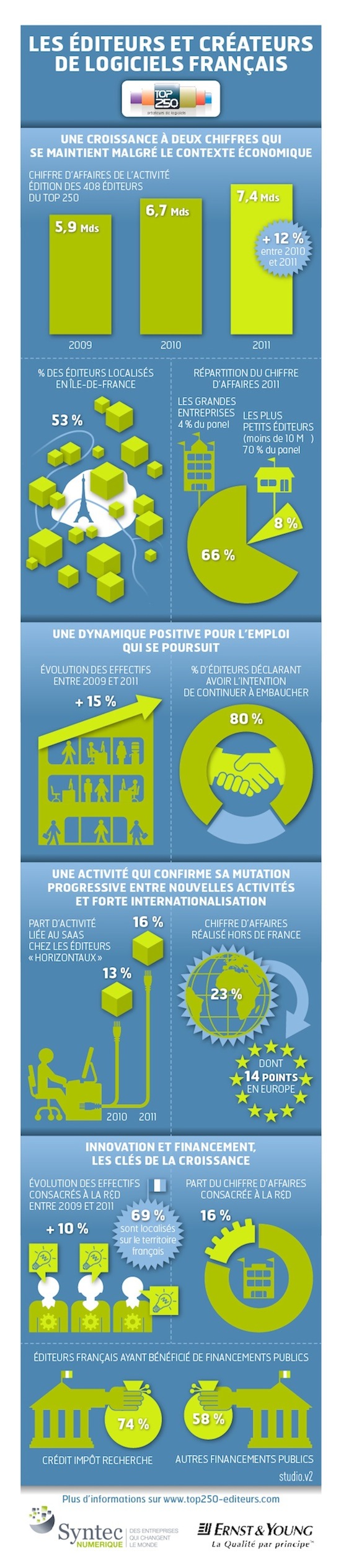 La deuxième édition du Top 250 des éditeurs de logiciels français, organisée par Syntec numérique et Ernst&Young, avec le soutien cette année du Syndicat National du Jeu Vidéo (SNJV), publie pour la deuxième année consécutive son « Top250, panorama des éditeurs et créateurs de logiciels français ». Composé de 408 sociétés, soit près de 40 % de plus que l’année précédente, ce panel a pour objectif de souligner la place incontournable du secteur de l’édition de logiciels dans la compétitivité de la France.
