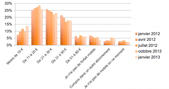 Enfin, on retiendra pour le secteur de la téléphonie mobile des chiffres indiquant la progression des forfaits à bas prix avec 60% des Français interrogés déclarant payer leur abonnement moins de 30€ par mois. Les forfaits à moins de 10€ par mois enregistrent une forte progression avec +86,8% d’abonnés en 2012.