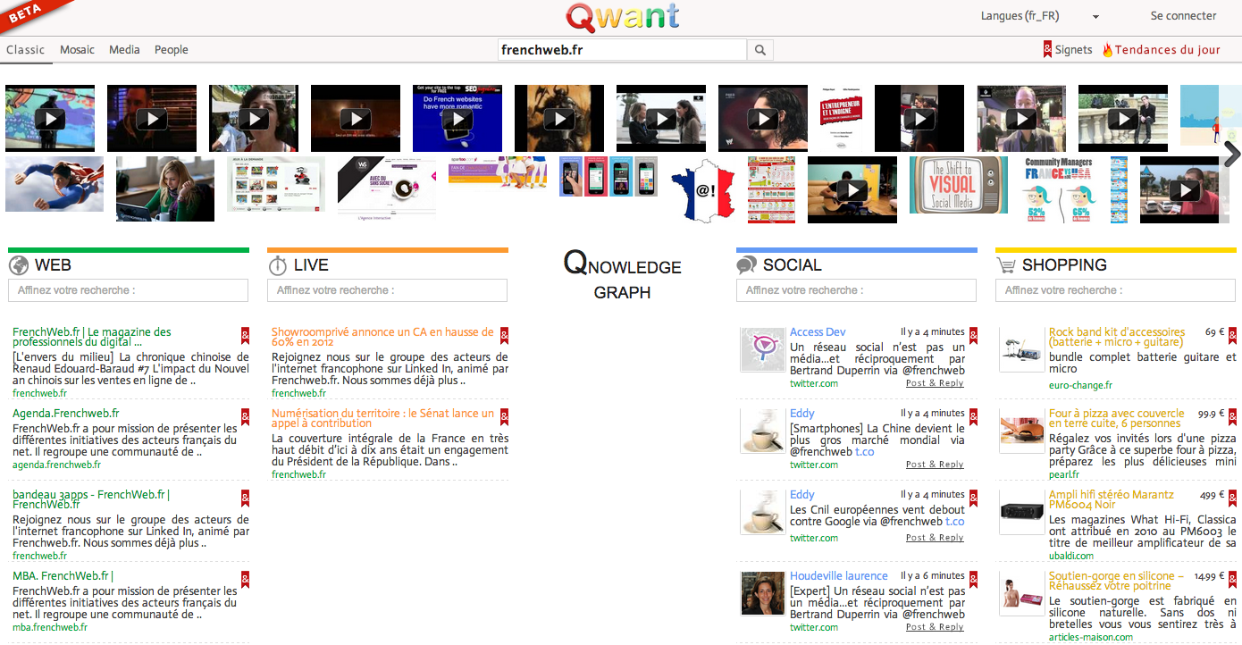 Allant plus loin, le blogueur soupçonne Qwant d’être un simple agrégateur de contenus qui utiliserait, outre Bing, les résultats des moteurs de Kurrently pour les recherches sur les réseaux sociaux ou Wikipédia et Amazon pour ses rubriques Qnowledge Graph et Shopping.