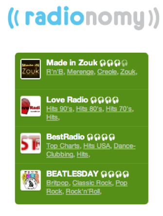 Lancé en 2007 à Bruxelles, le réseau de création et de découverte de radios en ligne, Radionomy, revendique aujourd’hui 5000 radios thématiques, une moyenne quotidienne d’un million d’heures streamées et pas moins de 14 M de VU dans le monde en septembre 2011. C’est aujourd’hui le leader européen dans le domaine des webradios.