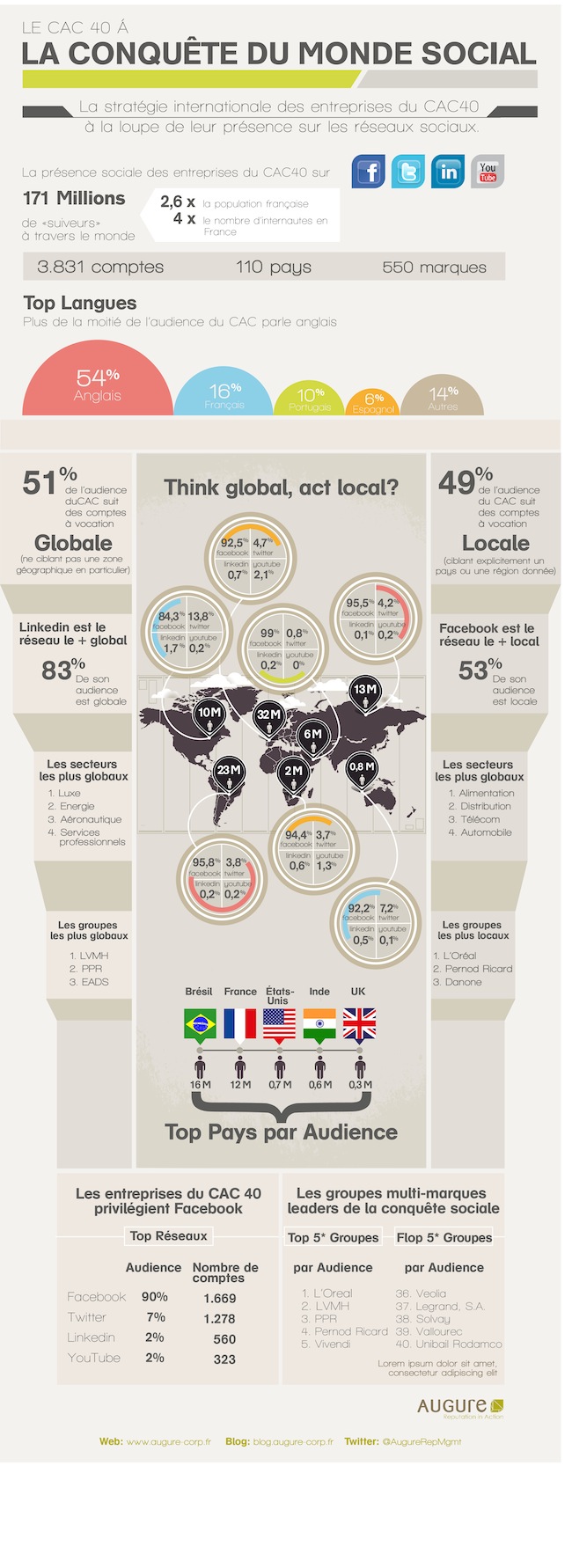 - Derrière l’anglais (54%) et le français (16%), 10% de cette audience parle portugais. En effet, le Brésil est le pays où les entreprises du CAC ont le plus d’audience avec 16 millions d’internautes, devant la France et ses 12 millions de personnes suivant les comptes des grands groupes.