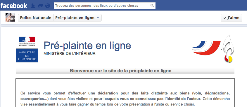 Les utilisateurs peuvent également déposer une pré-plainte sur Facebook lorsqu’ils sont victimes d’atteinte aux biens. Ils doivent ainsi remplir un questionnaire qui leur permet par la suite de prendre rendez-vous dans un commissariat et ainsi de mieux gérer leur temps et d’être accueillis dans de meilleures conditions au commissariat, qui aura déjà recueilli un certain nombre d’informations. Cependant, il faut toujours se déplacer au commissariat pour que la plainte soit définitivement enregistrée.
