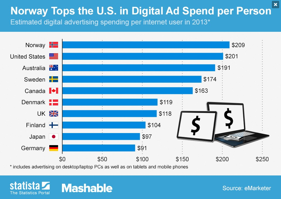 En Norvège, on casse vraiment la tirelire pour s’offrir 1 internaute Top 10 des dépenses en publicité en ligne http://t.co/cs3kFwzjRX